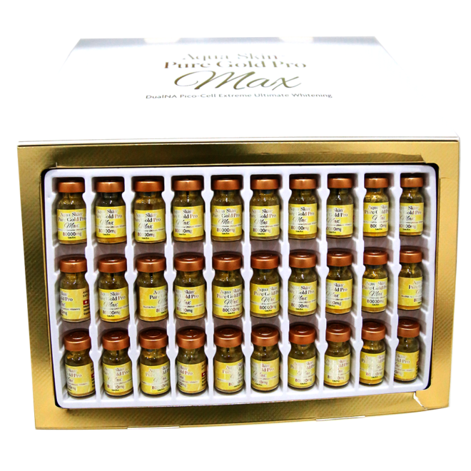 - What makes Aqua Skin Pure Gold Pro Max different from other skin whitening injections? Aqua Skin Pure Gold Pro Max represents a significant upgrade from standard formulas. In addition to a high dose of Glutathione, it contains powerful ingredients like Epidermal Growth Factor (EGF) and Gold Micro-Particles. Therefore, this unique blend offers more than just whitening; it also provides deep anti-aging and skin renewal benefits for a complete transformation.